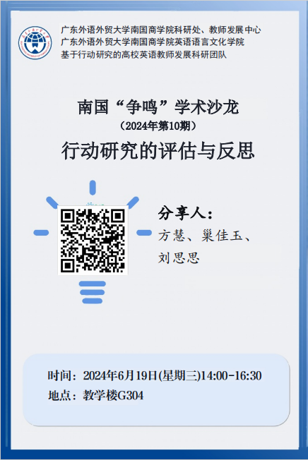 我校定于2024年6月19日(星期三)下午2:00-4:30在G304举办南国“争鸣”学术沙龙(2024年第10期)“行动研究的评估与反思”。