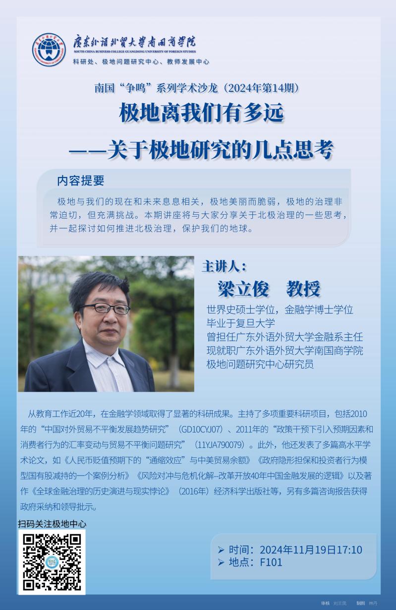 我校定于2024年11月19日(星期三)下午17:10在教学楼F101举办南国“争鸣”学术沙龙(2024年第14期)“极地离我们有多远——关于极地研究的几点思考”。