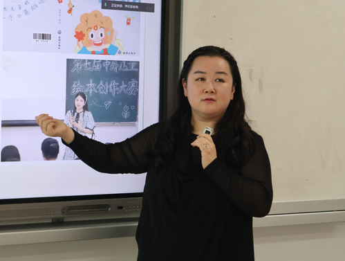 紧接着,主题分享环节正式开始。首先靳莎莎老师以“大美育视域下儿童美育对‘人心’现代化的关键作用”为主题,分享了约翰凯奇的音乐作品《4分33秒》,阐述了其无声的表演是如何引发观众从期待到愤怒的情绪变化,体现了人类对于美、对声音、对音乐理解的扩张。她还提及了不同时代对于美的认知变化,强调在不同视角下每个人对于美的界定是不同的。随后,靳莎莎老师提出了美的概念,描述了美育的发展史,还指出要想成为中华强国,就要提高孩子的素质教育以及终身的美感教育。最后她总结了美育的现代意义,并希望同学们把对美育的追求当作日常呼吸般的习惯,使美育为自己的精神世界披上坚实的“盔甲”。