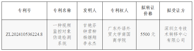 “一种视频监控对象伪造检测系统”发明专利权为广东外语外贸大学南国商学院拥有。经研究,我校拟进行成果转让,经使用天眼查软件系统查询,发明人与拟受让方深圳立专技术转移中心有限公司不存在关联关系。按照教育部科技部等《关于加强高等学校科技成果转移转化工作的若干意见》教技〔2016〕3号及学校相关管理办法的规定,现将我校拟转让发明专利权事宜予以公示,公示期15日,自2025年3月20日至2025年4月3日止。任何单位和个人如对转让有异议,可于2025年4月3日下午5:00前以书面形式送交知识产权管理与成果转移转化办公室(地址:行政楼206室)。异议应当签署真实姓名或加盖单位公章,并注明联系方式,逾期不予受理。