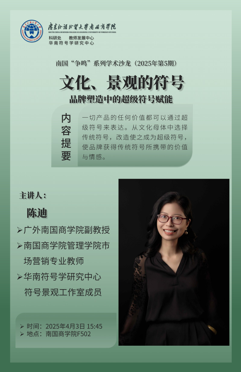 本校定于2025年4月3日在教学楼F栋502室举办南国“争鸣”学术沙龙(2025年第5期)文化、景观的符号。