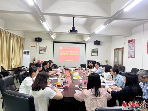 在近40分钟的自由交流环节中,两校围绕翻译硕士点建设与申报展开深度对话。我校团队与广东金融学院外国语言与文化学院领导,就外国语言文学学科发展规划、师资队伍建设、人才培养模式等核心议题,进行多维度探讨,现场研讨氛围热烈且富有成效。李明教授提议,希望建立校际师资协作机制,推荐我校优秀翻译教师担任广东金融学院翻译专业硕士授权点校外合作导师,涂兵兰院长对此做出了积极响应与充分肯定。双方达成了深化在翻译专业领域的交流合作,共同推动学科建设高质量发展的共识。
