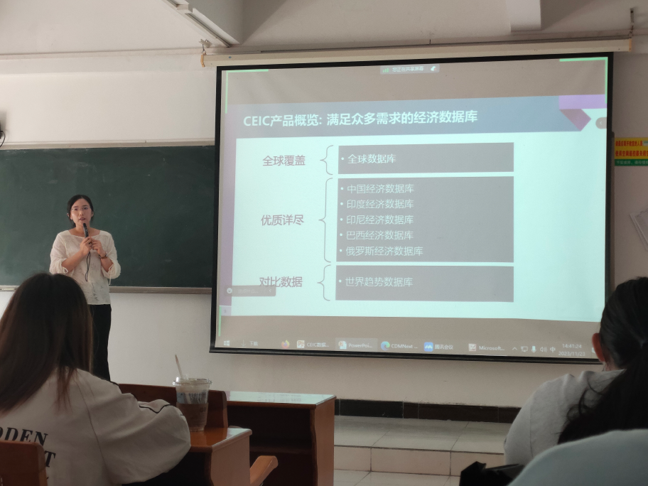 2023年11月23日14:30,南国图书馆在G402开展了以“CEIC宏观经济数据库使用介绍”为题的培训讲座。此次讲座为信息素养培训第五期第五讲,面向全校师生。主讲人为CEIC培训师李旻,共有150人参与。