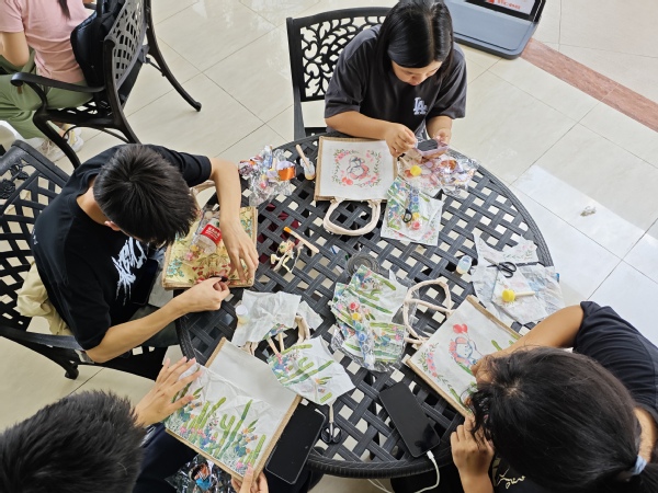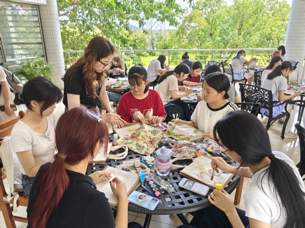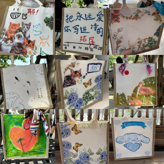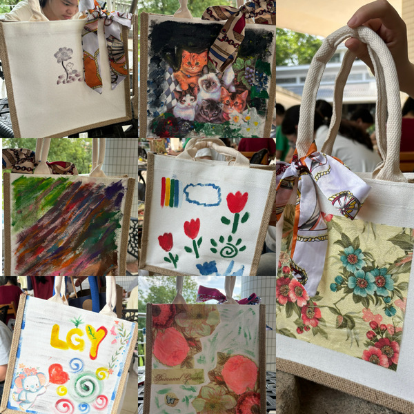 活动区域整齐摆放着空白帆布袋、材料包及丙烯颜料,供同学们自由选取。在馆员的专业指导下,大家充分发挥艺术想象,运用点线面的艺术组合,在白色布袋上绘制出属于自己的创意作品。作品中既有清新雅致的水墨风格呈现,也不乏色彩碰撞的现代艺术表达,原本朴素的帆布袋在妙笔勾勒中渐渐展现出独特的美学效果。