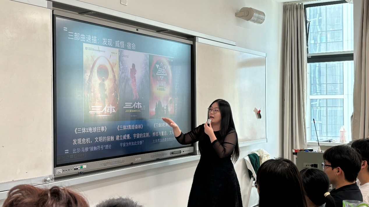 11月6日下午,图书馆“师生共读经典”系列活动第八期(总第48期)在教学楼H803顺利举行,吸引了众多学生积极参与。本次活动由文化与传播学院汪贝娅老师担任领读人,带领同学们一同走进刘慈欣笔下宏大而震撼的“三体宇宙”,从科幻、哲学与人性等多维视角,深入解读这部将中国科幻推向世界高度的文学经典。