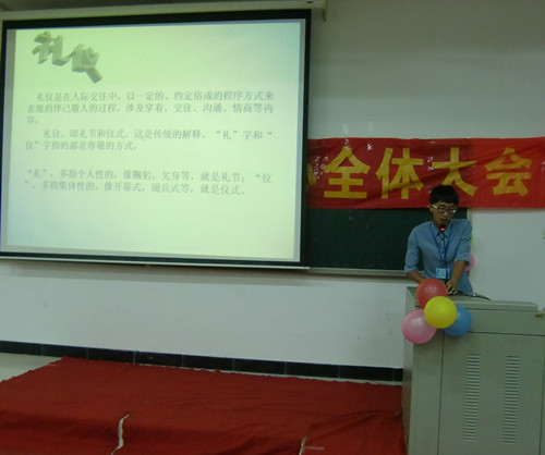 外联部副部长朱东涛作为本次主讲人之一。他以“坦诚相待、主动沟通、了解内心、适度赞美、把握尺度、选择时机”为切入点就“鼓掌礼仪、接待礼仪、名片礼仪、餐桌礼仪”等日常中待人接物的注意事项和要求为新干事们一一讲解并进行现场示范。详细而有序地阐述整个礼仪仪表的重要内容。