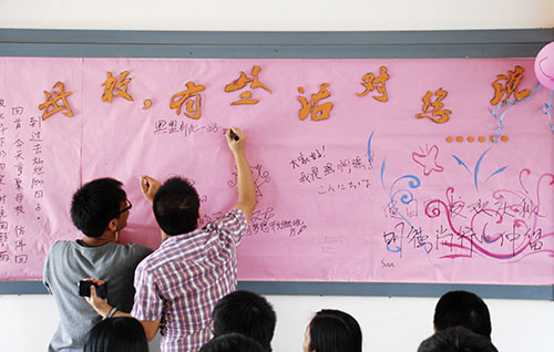 在休息室的后面,还有一期关于校友的墙报。校友们在休息之余纷纷用笔写下了“最想对母校说的话”,并争相在墙报前合影留念。“因为爱你,所以走近你;因为走近你,所以加倍爱你。你的名字不是最响亮,可是在我心里“南国”最闪亮。”来自管理系的校友李文玉如此表述她对母校的祝福。“最美丽的四年,我和南国一起度过。永远爱你,我们的南国!”来自英语系的曾宇羚校友感慨地说。很多校友也通过墙报大呼:“母校太贴心了!回一趟家,母校什么都帮我们想得很周全。”