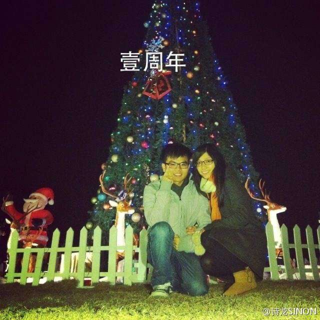 李诗龙、彭东莹于学校圣诞树前合影
