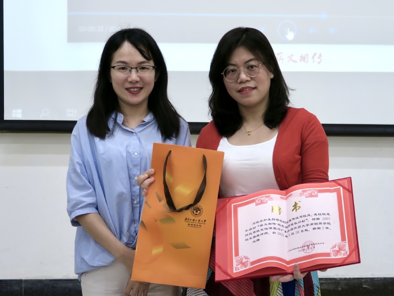 校友会翁琳为校友伍倩莹颁发讲师聘书及纪念品并合影(吴慧璇/摄)