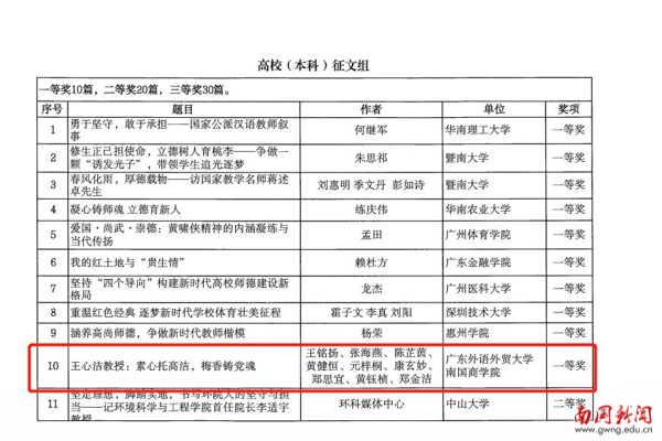 8月26日,2022年广东省师德建设主题教育月活动启动仪式暨第十一届师德主题征文及微视频征集活动颁奖典礼在广州举行。我校英语语言文化学院师生团队(王铭扬、张海燕、陈芷茵、黄健恒、元梓桐、康玄妙、郑思宜、黄钰桢、郑金洁)的参赛文章《王心洁教授:素心托高洁,梅香铸党魂》,荣获广东省“第十一届师德主题征文及微视频征集活动”高校(本科)组一等奖。
