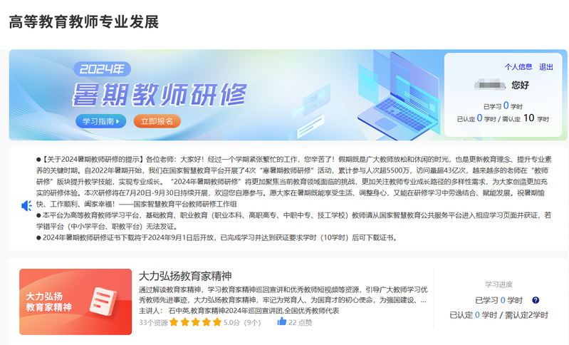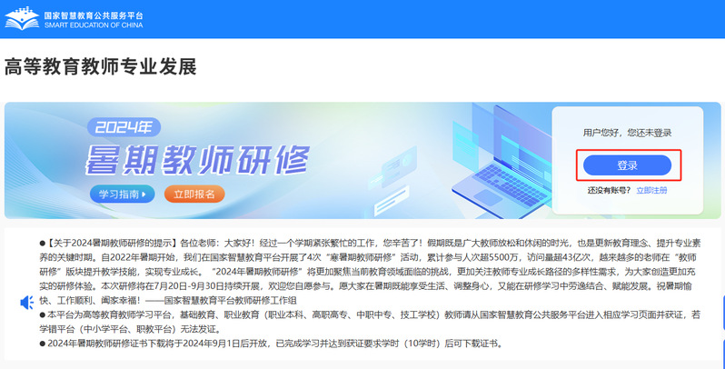 在 电 脑 端 打 开 国 家 高 等 教 育 智 慧 教 育 平 台 暑 假 教 师 研 修 专 题 网 址(特别提示:高等教育学习暂时不支持手机APP学习,但可使用手机浏览器学习,凡使用手机APP学习的基本可以判断进入的是基础教育学段。) :https://teacher.higher.smartedu.cn/h/subject/summer2024/