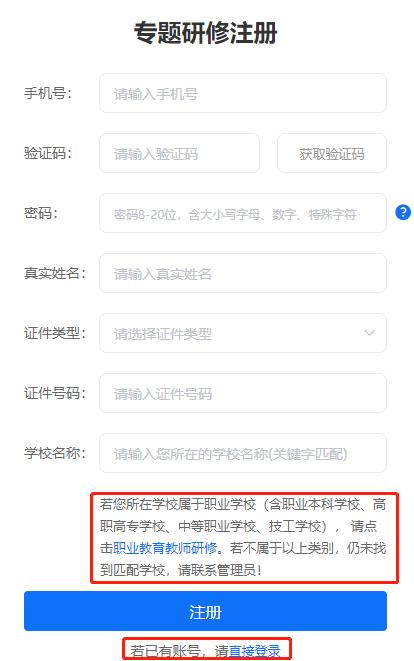 1.填写学校信息时,请输入关键字选择学校名称,若您所在学校属于职业学校(含职业本科学校、高职高专学校、中等职业学校、技工学校), 请点击职业教育教师研修。若不属于以上类别,仍未找到匹配学校,请联系管理员!