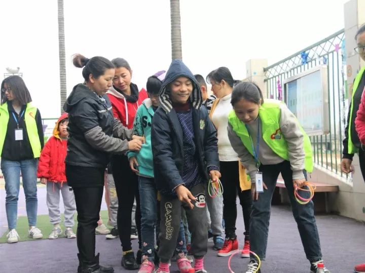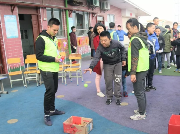 志愿者们耐心地给小朋友们讲解游戏规则,小朋友们积极地参与,大家都投入了这个欢乐的氛围。