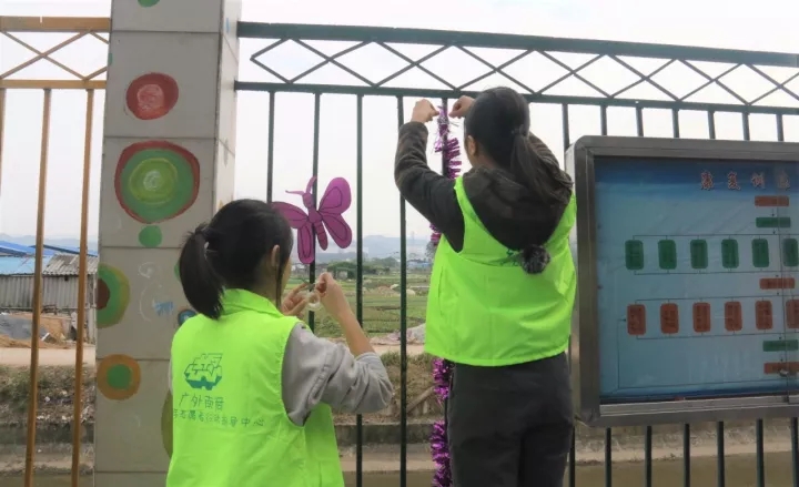 ▲志愿者们在装饰活动场地
