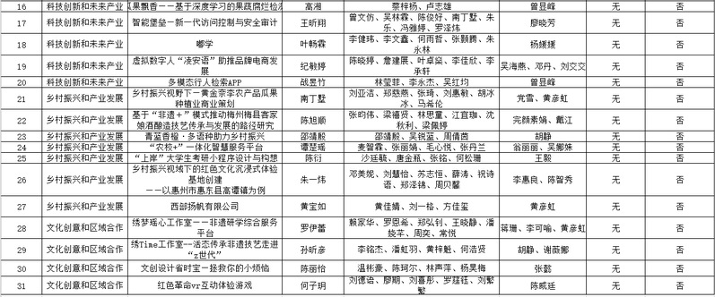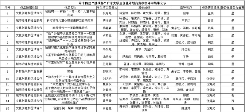 根据团省委《关于举办第十四届“挑战杯”广东大学生创业计划竞赛校赛的通知》相关要求,校团委组织开展第十四届“挑战杯”广东大学生创业计划竞赛校赛,经学院选拔推荐、校级复赛、校级决赛三个环节,最终评出金奖1名、银奖3名、铜奖5名和优秀奖6名,现拟推荐《智绘树——解锁“一带一路”儿童幸福密码》等12项作品参加省赛,公示如下: