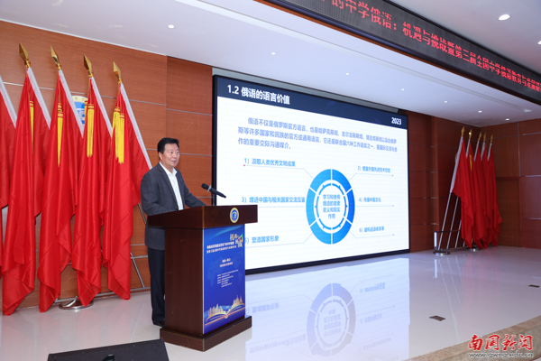 本网讯 2023年12月29日,我校副校长王铭玉应邀出席海南自贸港建设背景下的中学俄语:机遇与挑战暨第三届全国中学俄语教育与发展研讨会并作主旨演讲。王铭玉分析了俄语课程的性质及功能,并提出了培养学生“自主学习”俄语能力的建议。我校俄语系副主任李洋在研讨会论坛发言,探讨中学与高校俄语教学衔接策略。