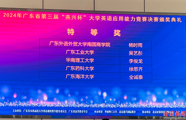 本网讯 11月2至3日,2024年广东省“燕兴杯”大学英语应用能力复赛和决赛在华南理工大学五山校区举行。我校大学英语教学部派出的5名参赛学子(指导老师:于洪鉴,彭宇红)分别获得1项特等奖、1项二等奖、2项三等奖、1项优秀奖。其中,杨时雨同学(24小语种创新班)以全省第一名的成绩获特等奖,创下我校自参赛以来的最好成绩。