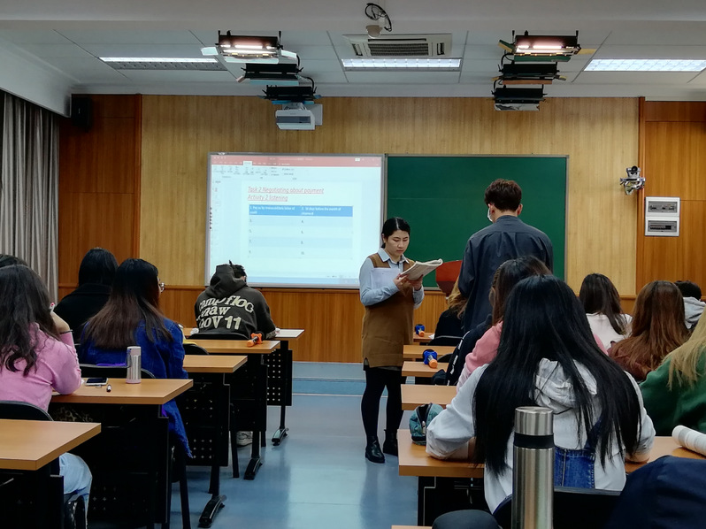 本次公开课主题为《Event English》——Negotiating Business,内容主要包括Task2 Negotiating about payment和Task3 Negotiating about shipment两部分。在Task2部分,陈老师首先播放一段听力材料,然后请学生完成表格填空。Task3部分包括了两个活动,活动一:阅读,陈老师邀请了两位学生朗读一段对话,然后让学生做两个小任务,一个是判断题,另一个是词汇填空;活动二:角色扮演,陈老师先请两组学生分别扮演不同角色进行对话,然后让学生讨论几个问题。