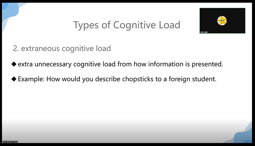 (2)外在认知负荷。相同的教材内容以不同方式呈现时,对学生会产生不同程度的负荷。例如教外国人如何使用筷子,用口语或书面形式教授时不够具象,会产生较高的外在认知负荷而阻碍学习,反而放上一张握筷子的手势图,会更加直观易懂。因此,教师如何适当地呈现教材内容以降低学生外在认知负荷尤为重要。