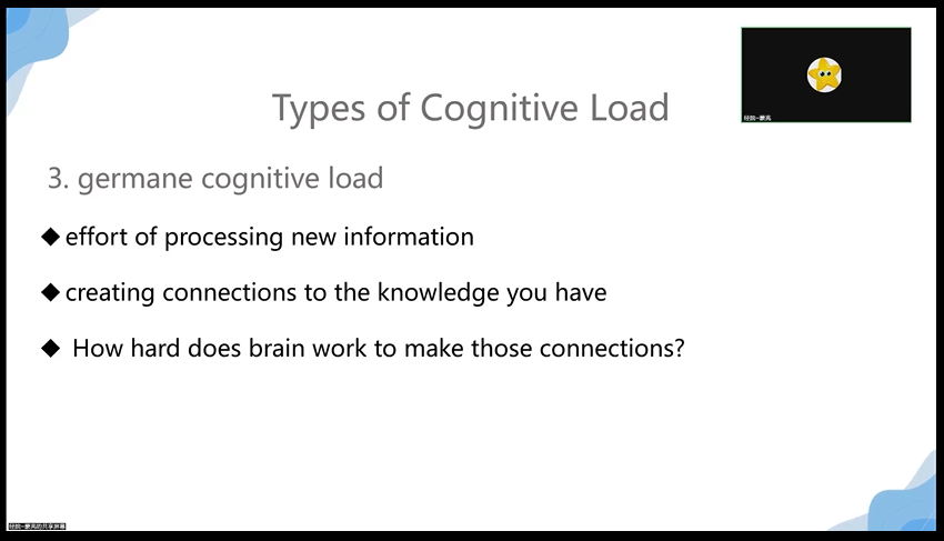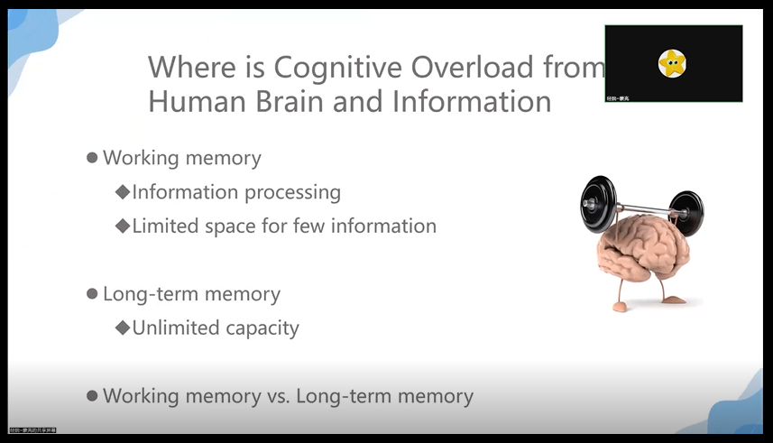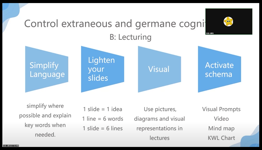 蒙亮老师讲到,教学的目的是要增加长期记忆中的知识。欲达此目标,我们必须考虑到人的认知在处理新信息时,其工作记忆的容量是有限的。因此重点是,如何有效地呈现信息以减少工作记忆的负荷量,并促进信息从工作记忆状态转变为长期记忆的存储状态。