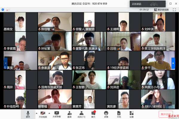 新团员宣誓 典礼在雄伟的国歌声中拉开帷幕,83名新团员进行了庄严又别开生面的“云宣誓”。团委书记、学生处处长卢少勇向全体与会人员宣读《关于表彰2019年度五四先进集体及先进个人的决定》。 经济学院2017级税收学专业的阮翠珊和经济学院2017级经济学专业的詹广霞分别代表优秀组织和优秀先进个人代表发言。她们一致认为,作为新时代的青年大学生,应该坚守初心、热爱祖国,在社会实践中体现自我价值,践行真正的五四精神;应该用知识武装头脑、丰富实践经验、提高自我要求,争当五四优秀青年;应该以身作则,发挥共青团干部的模范带头作用,用激情与活力感染身边的每一个人;还应勇于担当时代的重任,时刻铭记五四青年精神,不忘初心,为实现中华民族伟大复兴的中国梦不懈奋斗。