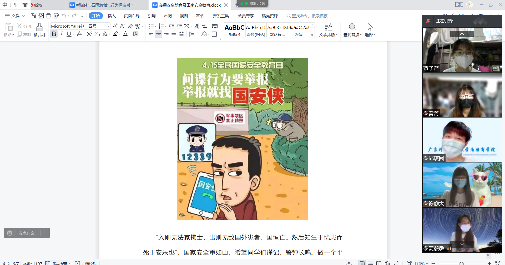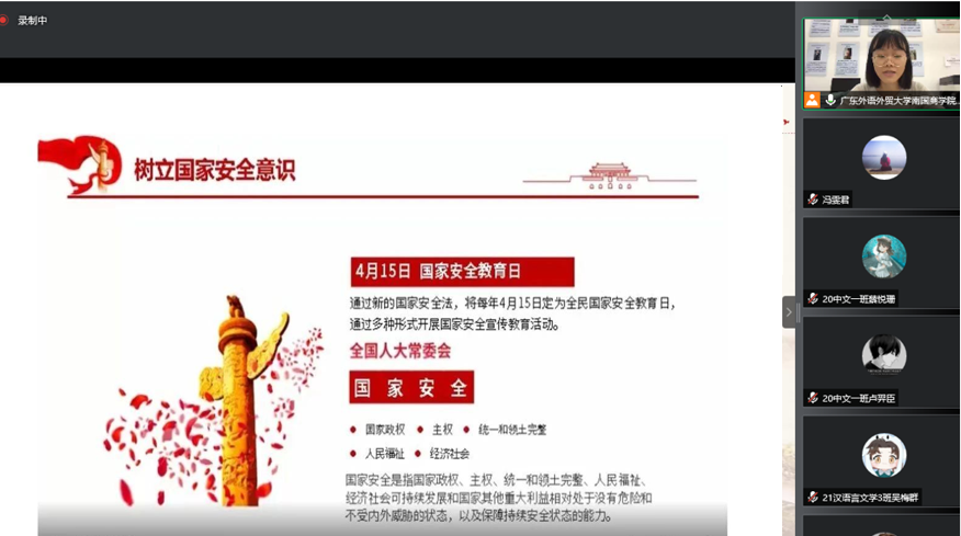 4月28日中午12:00,为了培养学生树立维护国家安全的意识,增强学生防范和抵御安全风险的能力,新媒学院辅导员李金萍老师组织2020级和2021级网络与新媒体专业共5个班级在腾讯会议召开了 “全民国家安全教育日”主题班会。