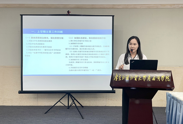 学生处学生资助中心主任余小玲、学生科副科长李惠良、思想政治教育科副科长陈国静、心理健康教育与咨询中心副主任梁晓闻、校团委副书记徐燕萍对2025年秋季学期学生资助工作、学生日常管理与突发事件应急处理、思想政治教育工作、学生心理健康教育工作、校团委等重点工作进行部署和说明。