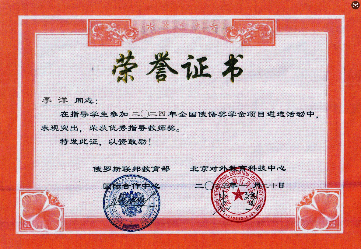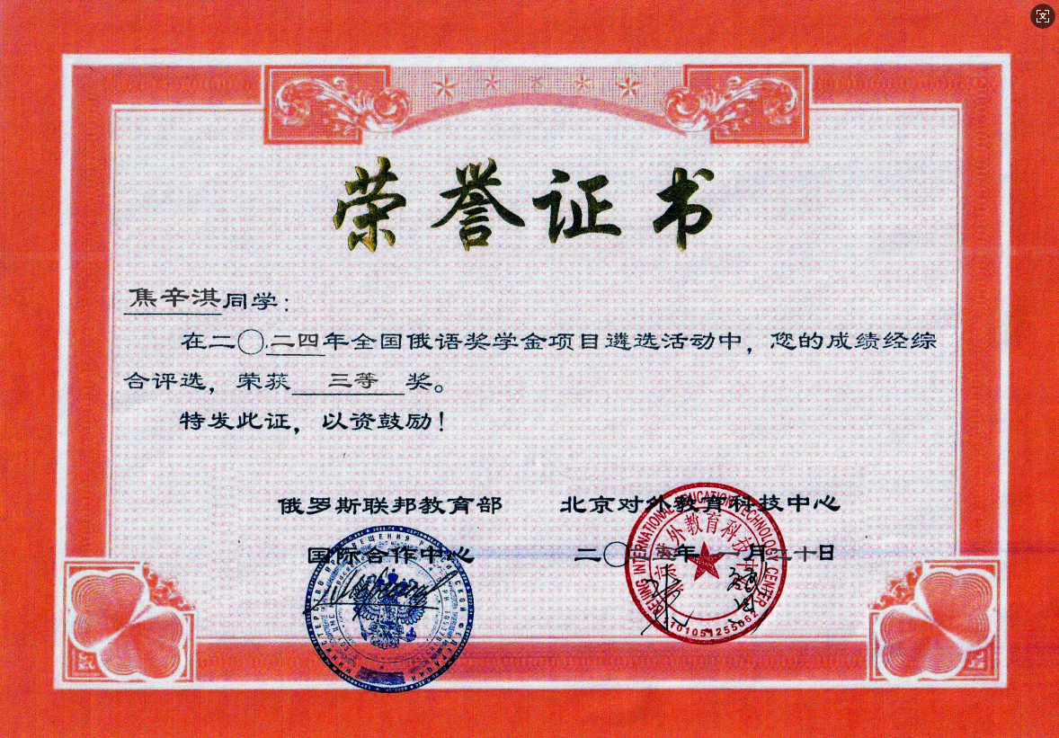 俄语奖学金项目由ТРКИ中国俄语考试中心主办、北京对外教育科技中心承办,并得到诚永固集团的大力支持,是推广俄语单科成绩的奖学金项目。评选采用严格的在线考试形式,于2024年12月14日至15日进行,分为中学组和大学组两个组别。本次评选吸引了全国103名优秀学子参与角逐,竞争激烈。经过系内推荐和综合遴选,我校俄语系推荐的焦辛淇、刘洁怡两位同学脱颖而出,双双斩获三等奖,指导教师于凤颖、李洋获得“优秀指导教师奖”荣誉称号。
