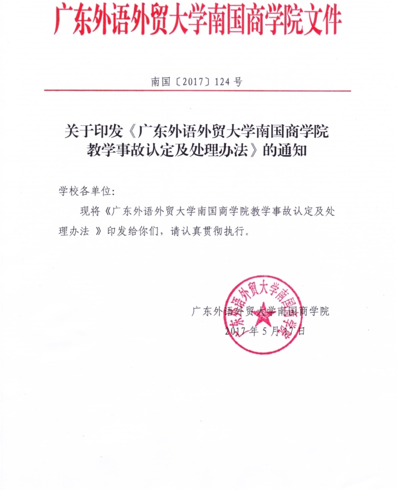 关于印发《广东外语外贸大学南国商学院教学事故认定及处理办法》的通知