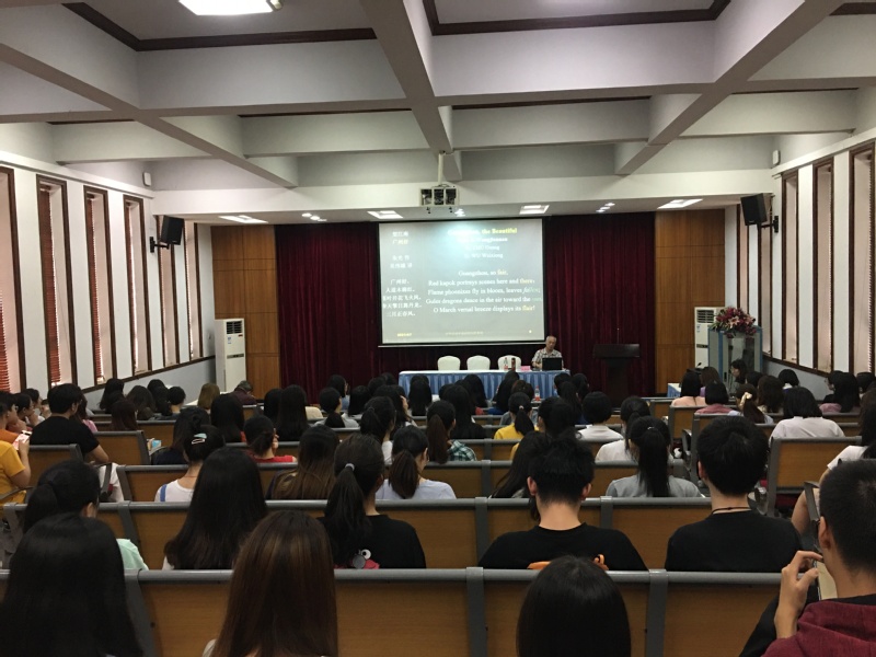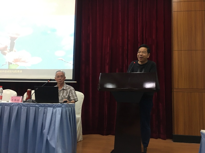 讲座伊始,吴教授介绍了自己和英语的故事。随后吴教授从Why Study Poetry?说起,通过具体诗词翻译探讨中英诗歌的“音乐美”、鉴赏与翻译,从实践出发,不空谈理论,寄精深于浅白,化繁难为简易,以期有助年轻学人从繁难、深奥和神秘的诗词印象中解放出来。再从应用翻译目的论和语用功能出发,结合多年从事地方外事工作的翻译实务和后期的教学实践,根据涉外活动中诗词佳句汉英翻译要求当场见效快的特点,提出“追求最高境界”和“译出最佳效果”的译诗原则和七大对策。