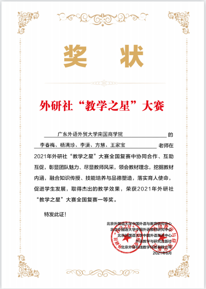本网讯 2021年6月17日,高等英语教学网发布2021年外研社“教学之星”大赛(本科英语组)全国半决赛晋级名单及全国复赛获奖名单,我院《综合英语》教学团队喜获全国复赛一等奖。此团队成员为英语系教师李春梅、李潇、杨满珍、方慧、王家宝。