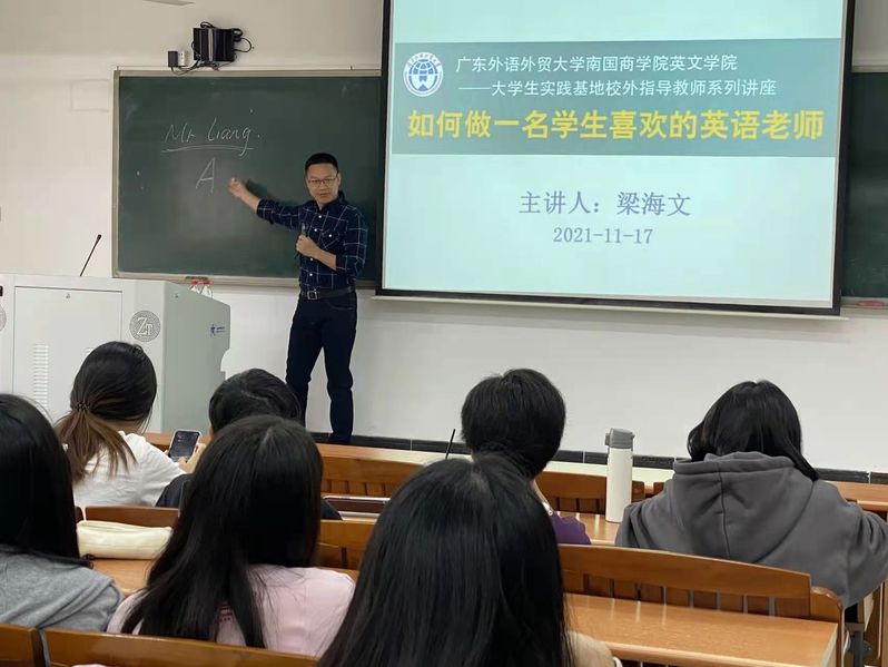 本网讯 2021年11月17日下午2点,英文学院在多媒体教室G303举办“如何做一名学生喜欢的英语老师”的专题讲座,邀请了广外附小梁海文老师做主讲嘉宾。梁老师是广外附小英语老师,广州市小学英语优秀学科组长,全国生本教育实验基地导师,广州市小学英语电视课堂审查组副组长。本次讲座为英语系所组织,由英语系主任李春梅副教授主持,我院英语专业及英语(师范)专业全体师生参加,全场座无虚席。