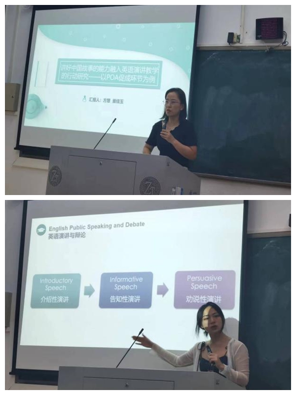 活动首先由巢佳玉老师和方慧老师分享了POA行动研究设计——“讲好中国故事的能力融入英语演讲教学的的行动研究------以POA促成环节为例”。方慧老师介绍了研究背景、研究意义、文献综述、所用理论、研究问题和研究设计;巢佳玉老师介绍了如何具体在“英语演讲与辩论”这门课程中开展她们的研究。针对方慧老师提出的困惑。杨满珍教授指出教学生“讲好中国故事”应该关注如何用英语讲好故事,而不仅仅是提高学生对中国文化的了解。杨文滢教授就论文题目的修改给她们提了一些建议。李春梅副院长则建议分清一般表达和对中国文化的表达的区别。