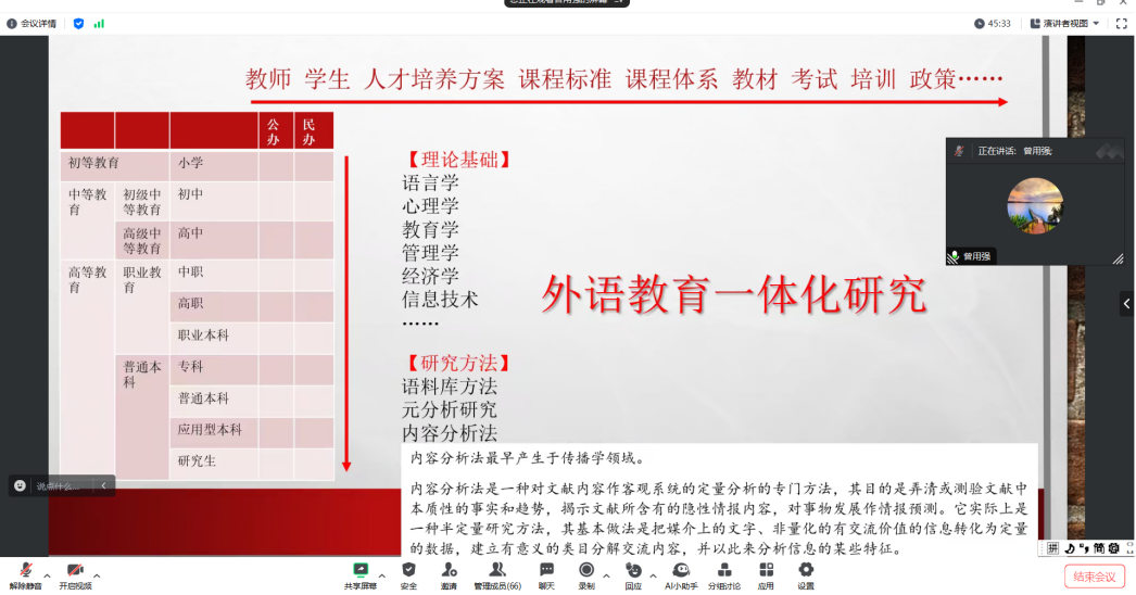接着,曾用强重点对如何在该二级学科框架下对我国外语教育进行一体化研究与改革提出了独到的思考。他论述了一体化研究的理论基础、研究内容和研究方法,指出其两个主要特点:一、跨学科性,即从教育学、心理学、管理学、外语教学、语言测试等多学科角度研究外语教育问题;二、全学段性,可涵盖小学、中学、专科、本科、研究生各个学段。研究内容上,这种外语教育研究与改革涉及教师、学生、人才培养模式与方案、课程标准与体系、教材、考试、培训、语言政策等方方面面;研究方法上,可使用语料库法、元分析研究法、内容分析法、聚类分析法等。