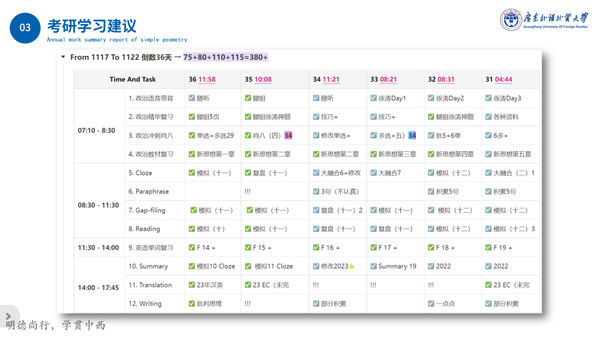 罗彩怡同学聚焦考研过程中的时间管理与心态调整进行分享。她强调,合理的时间规划与良好心态是考研成功的两大关键要素。她建议同学们依据自身实际状况制定学习计划,并在备考期间始终保持积极乐观心态,稳扎稳打向目标迈进。