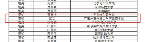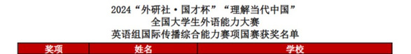 本网讯 12月9日,2024“外研社·国才杯”“理解当代中国”全国大学生外语能力大赛公布了英语组国赛获奖名单,我院2022级英语(师范) 卓越班江艾同学(指导教师:王家宝、方慧、兰玉)获得国际传播综合能力赛项铜奖。