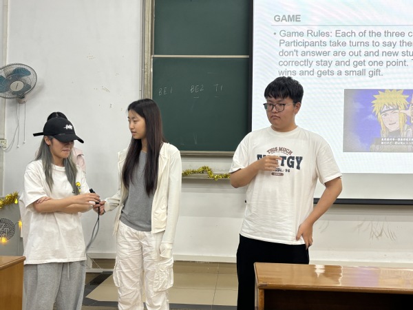 点评结束后,进入到同学们期待已久的游戏环节。三个班级各自派出两名同学参与游戏,每位参与者轮流说出与主题相关的单词,未能回答的同学将被淘汰,由下一位同学继续作答,答对的同学则继续进行游戏并获得一分,最后获胜的同学可以为本班赢得小零食。游戏环节里,同学们凭借丰富词汇储备和敏捷思维能力,快速应答,充分展现出了自身实力,整个过程精彩不断,最终,来自商英1班的同学在游戏中获胜。