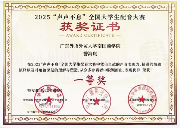 近日,由中华出版促进会全媒体人才专业委员会、中国广播影视培训网及北京新视听国际传媒中心联合主办的2025年“声声不息”全国大学生配音大赛圆满落幕。在这场高手如云的赛事中,我院2022级英语(师范)10班的誉海岚同学凭借出色的表现,从众多参赛者中脱颖而出,荣获一等奖。