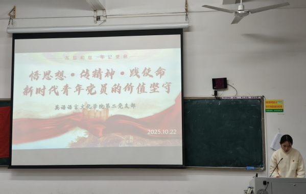 为深入学习贯彻习近平新时代中国特色社会主义思想,引导青年党员坚定理想信念、传承红色基因、勇担时代使命,英文学院第二党支部于10月22日在G103教室举办“悟思想·传精神·践使命——新时代青年党员的价值坚守”主题党日活动。支部全体党员参加,并围绕主题展开深入交流与研讨。