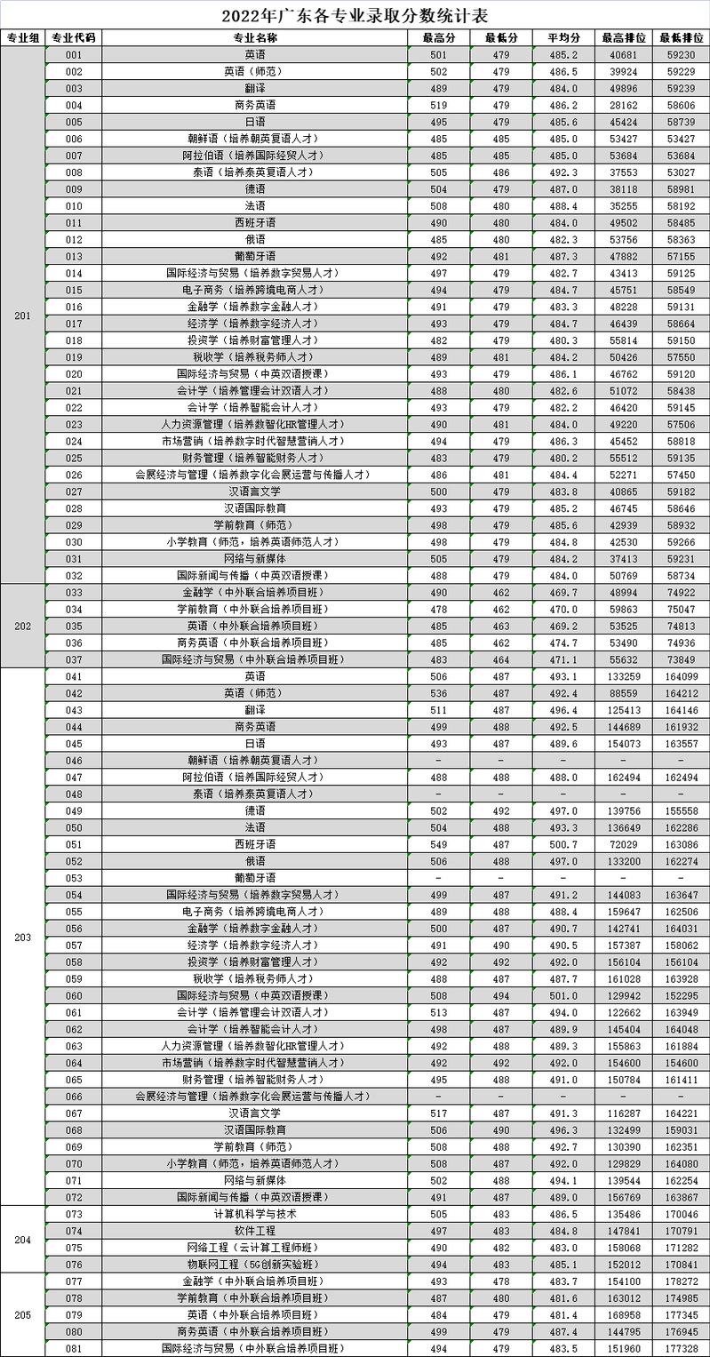 2022年广东各专业录取分数统计表(夏季普通高考)