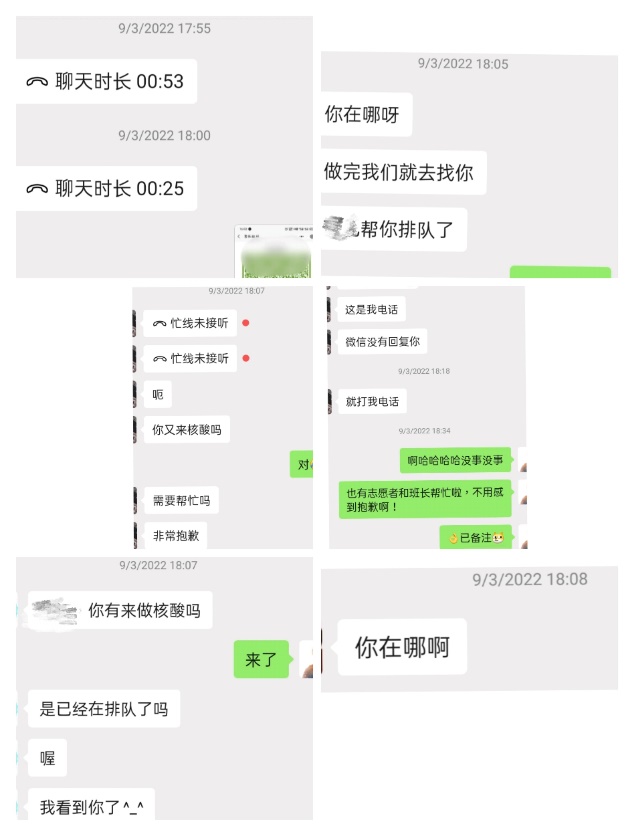 这两张图片拍摄于封校期间,我在当志愿者的时候,其他工作人员和同学说拍下的。当时封校通知很紧急,核酸检测缺大量有丰富经验的志愿者,‘时间急,任务重’。而我之前做过多次类似的志愿者活动,懂的如何去处理维持秩序。所以就勇当先锋去当志愿者,勇气战胜了害怕,当时我还带了酒精消毒液帮其他志愿者消毒。
