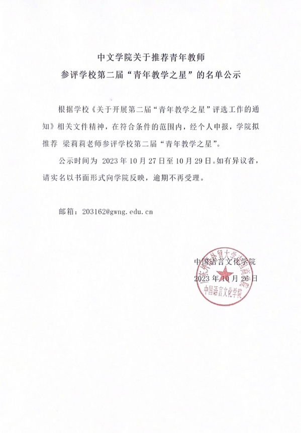 中文学院关于推荐青年教师参评学校第二届“青年教学之星”的名单公示