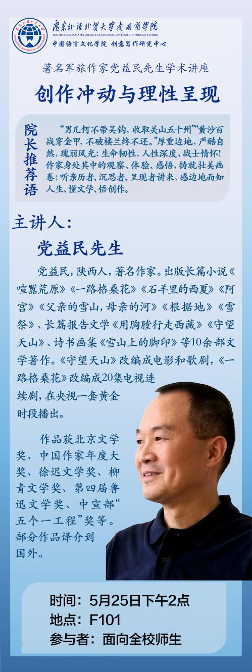 应南国商学院之邀,2024年5月25日下午,著名军旅作家党益民先生于学术报告厅作《创作冲动与理性呈现》学术讲座,中文学院师生近百人出席聆听。