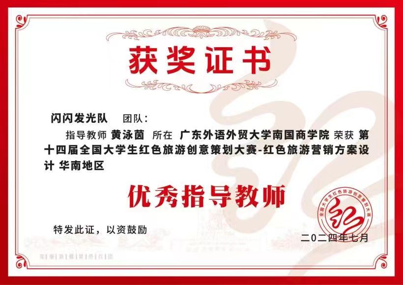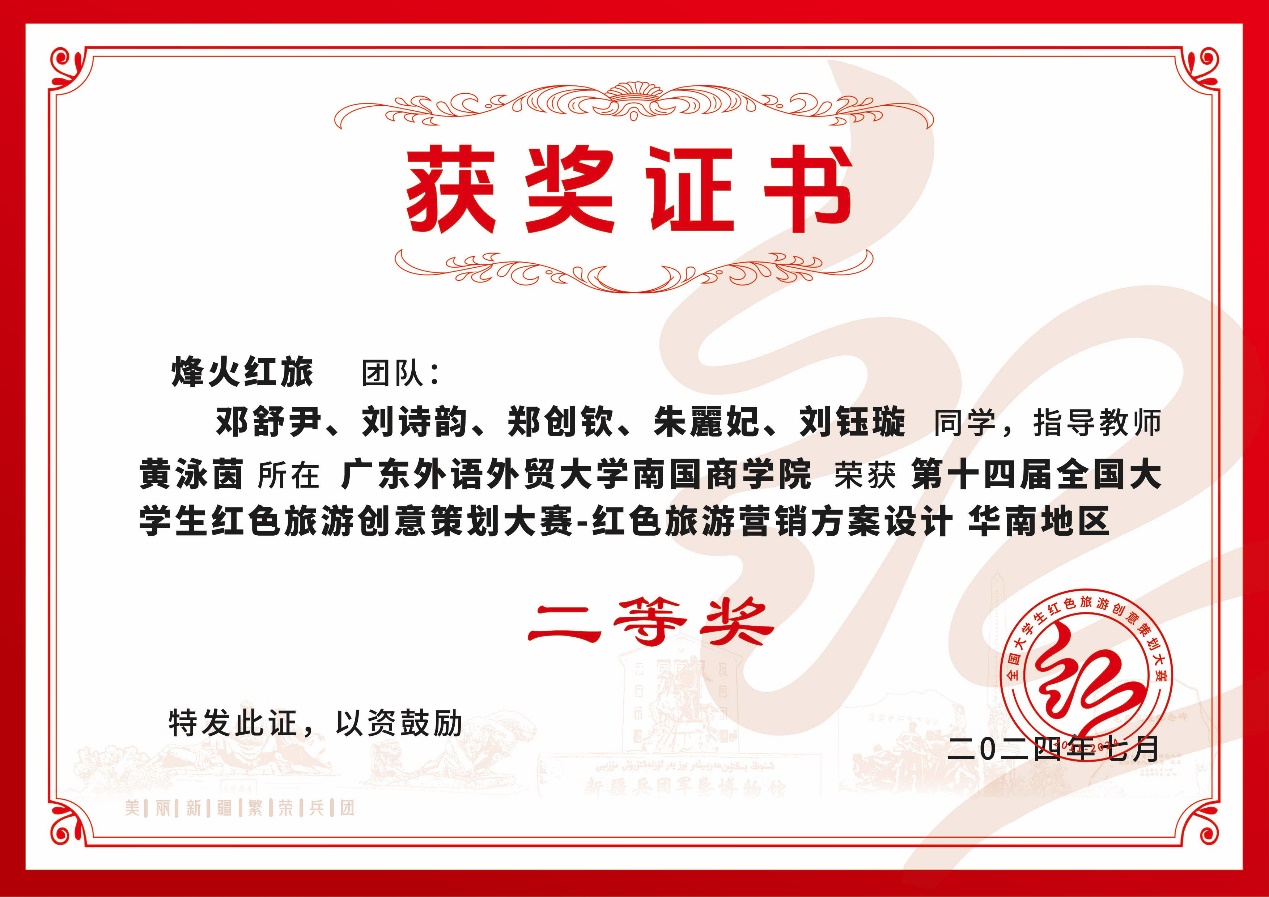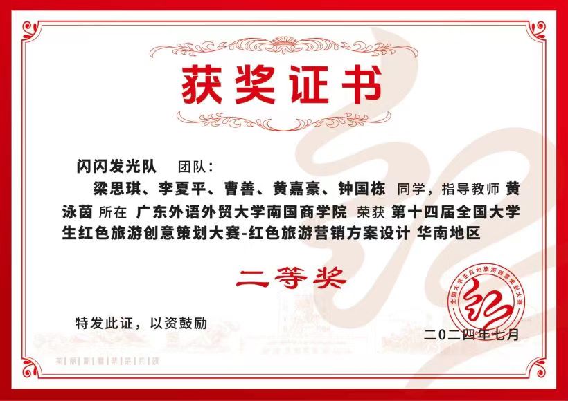 本网讯 近日,由文化和旅游部资源开发司、国家发展改革委社会发展司、共青团中央宣传部、新疆生产建设兵团文化体育广电和旅游局等单位主办的第十四届全国大学生红色旅游创意策划大赛落下帷幕,我校“闪闪发光队”和“烽火红旅队”经过激烈的角逐,最终获得“红色旅游营销方案设计”类别华南赛区二等奖,指导老师黄泳茵获得“优秀指导老师”称号。