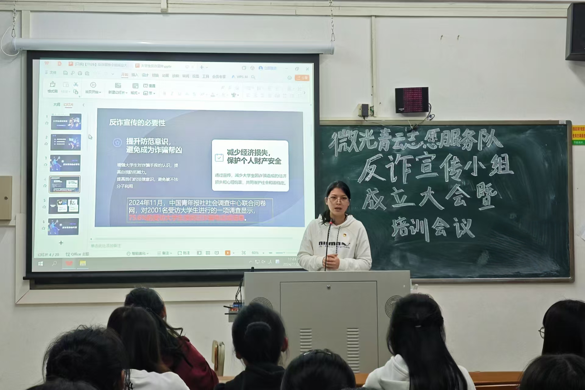 为深入贯彻国家关于防范电信网络诈骗的重要指示精神,积极响应校园安全建设的号召,提升大学生群体的防骗意识与能力,中国语言文化学院微光青云志愿服务队于11月25日下午5点在B102举行反诈宣传小组的成立大会暨培训会议,通过组建反诈宣传队伍,共同构筑起一道坚实的校园安全防护网。