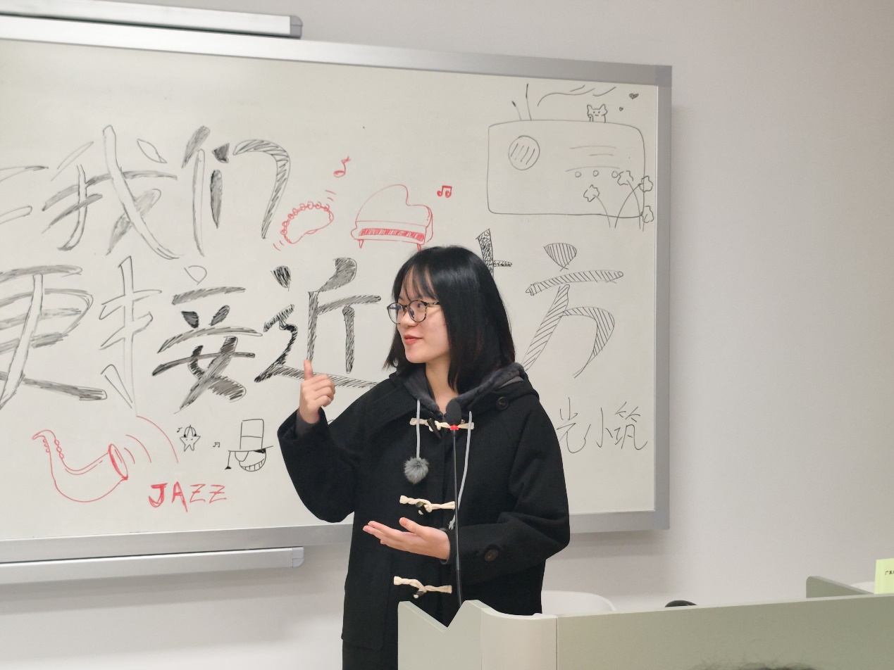 音乐分享环节中,参与者们轮流走上讲台,结合精心挑选的歌曲MV,剖析了歌曲的风格特点及其对自己产生的深刻影响。其中,王禹晴同学选择了《我的一个道姑朋友》,讲述了自己经历的一段遗憾恋情,并且通过这首歌找到了情感的宣泄口;郑媛壬同学则分享了《正解》这首歌对自己未来人生规划的启示,让她对青春“正解”进行思考;分享«时停错觉»的刘日昇同学因一部电影爱上了这首歌,从他的话语中,我们可以感受到他对其中美好感情的向往以及触动;以及高芷晴同学分享的«葡萄成熟时»这首经典曲目,唤醒了大家的冬至回忆,分享者还在其中感悟到了生活中的智慧与哲学。因为同一首歌曲在不同的时间、地点倾听,也会产生新的感触……每位分享者的真情流露都深深触动了在场的每一个人,现场不时响起热烈的掌声。