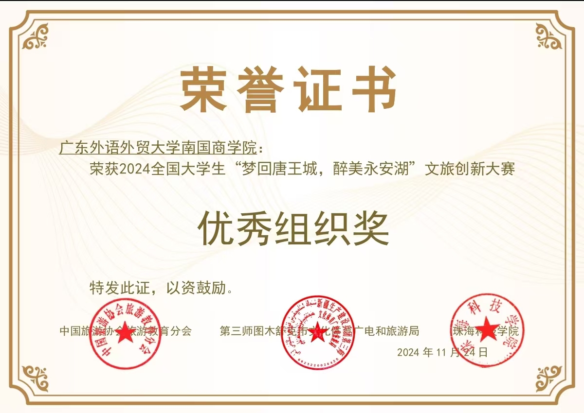 本网讯 近日,由中国旅游协会教育分会、第三师图木舒克市文化体育广电和旅游局、珠海科技学院等单位主办的2024全国大学生“梦回唐王成,醉美永安湖”文旅创新大赛圆满结束。在这次竞赛中,来自中文学院的“沙律鹰喙队”在众多参赛团队中脱颖而出,荣获“图木舒克市旅游目的地营销策划”类别华南赛区一等奖,成为我校在该赛事中唯一获奖的团队,指导老师邢雷获得“优秀指导老师”称号,学校获得“优秀组织奖”称号。